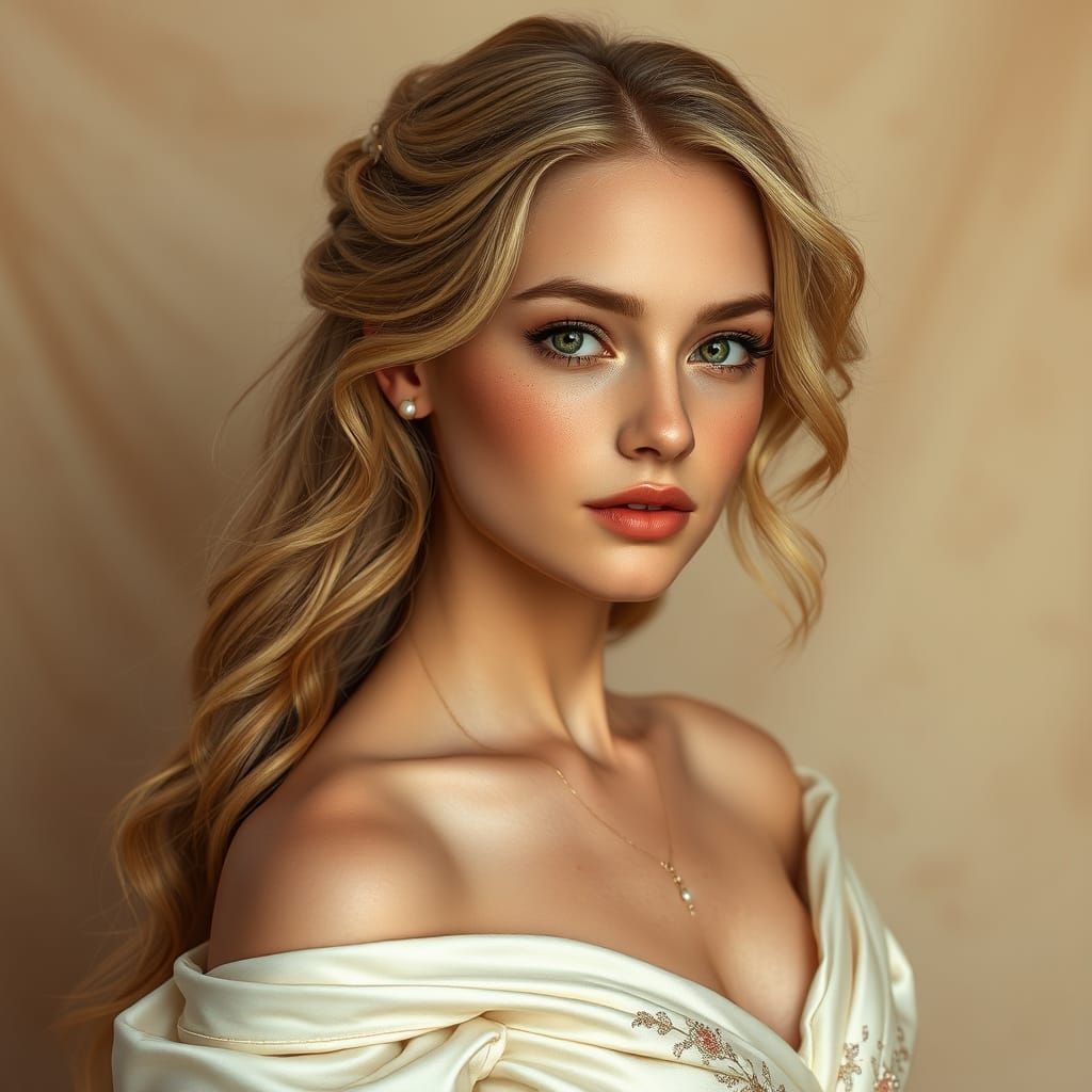 This image shows a young woman in a stunning cream satin wedding dress with intricate embroidery, surrounded by a soft, golden glow and a muted beige backdrop, evoking a romantic, ethereal ambiance.