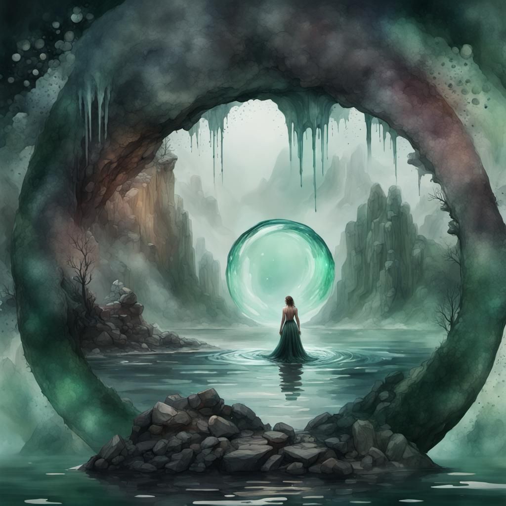 This image shows a dark green and grey watercolor painting. A small circle hovers above a larger semicircle, with a subtle female figure integrated into the abstract design. The artwork has a fantastical, splash-screen quality.
