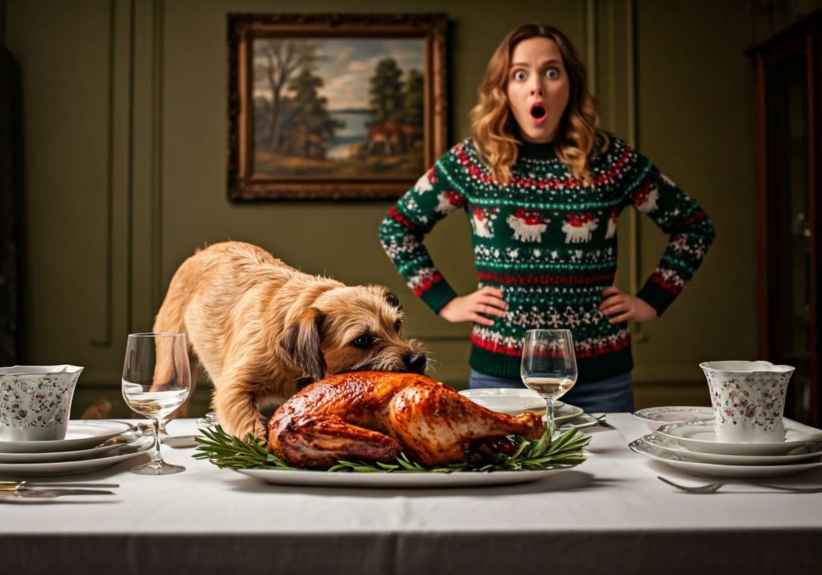 I know exactly how the lady in the sweater feels. My cat will undoubtedly be okay until I take the turkey out of the oven. Then he'll lose it. He'll go completely berserk. He would do exactly what that dog's doing if I don't stop 'im.