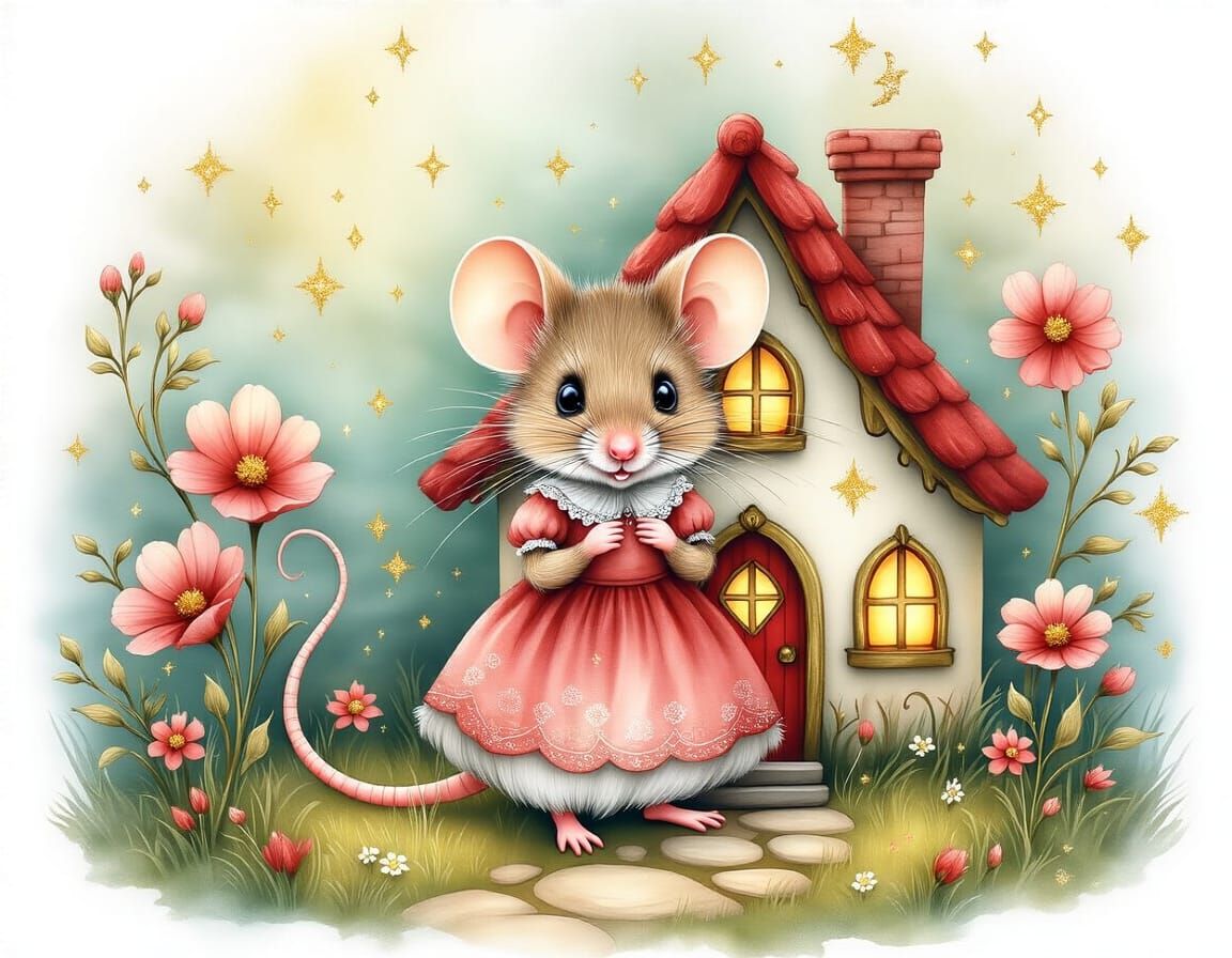 This enchanting watercolor illustration depicts a charming mouse in a dress awaiting a visitor outside her floral adorned home. Features whimsical details and a dreamy, ethereal glow.