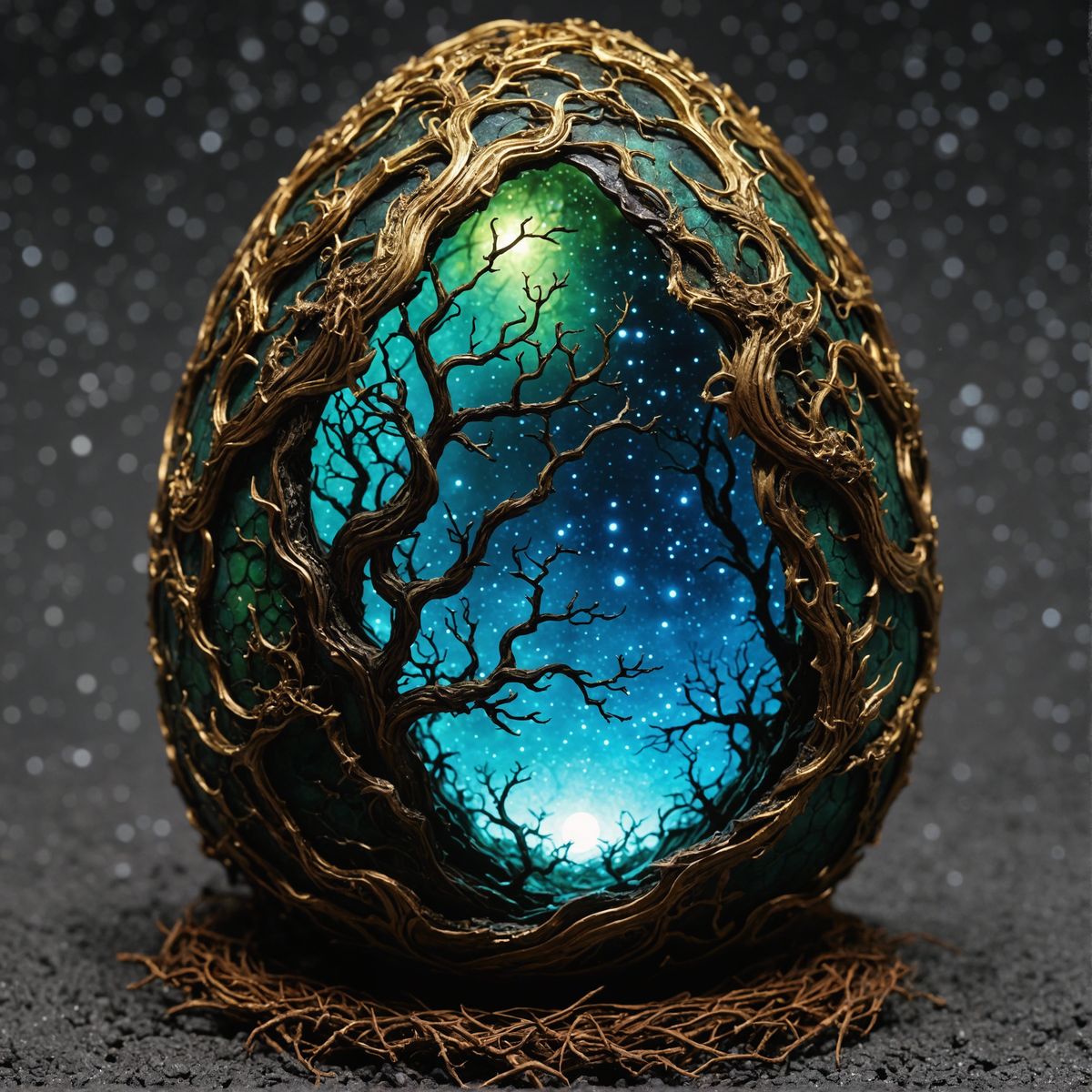 This image shows a dragon egg with magical colors, resting in a natural nest under a night sky. The egg is ornately decorated and bioluminescent, within a magical grove.