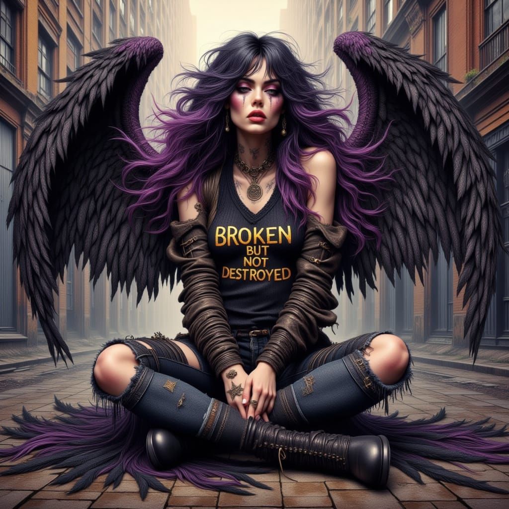 This enchanting image depicts a mystical woman with disheveled purple and black hair, vibrant eyes, and tattered wings, set against a city alley backdrop with intricate design and magical sparkles.