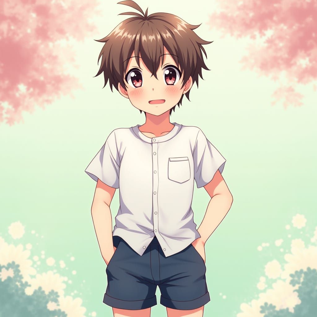 This image shows a cute anime boy with expressive eyes and a warm smile, dressed in a school uniform against a soft, pastel-colored Japanese garden backdrop. Delicate lines and vibrant colors evoke a sense of youthful energy.