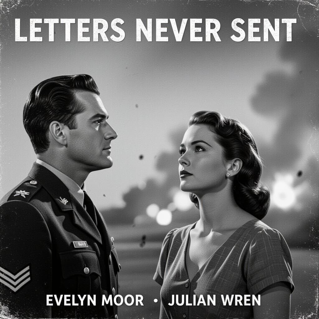 A dramatic black and white image of a soldier and a woman looking upwards, with explosions in the background. This vintage image evokes film noir with dramatic lighting and grainy textures.