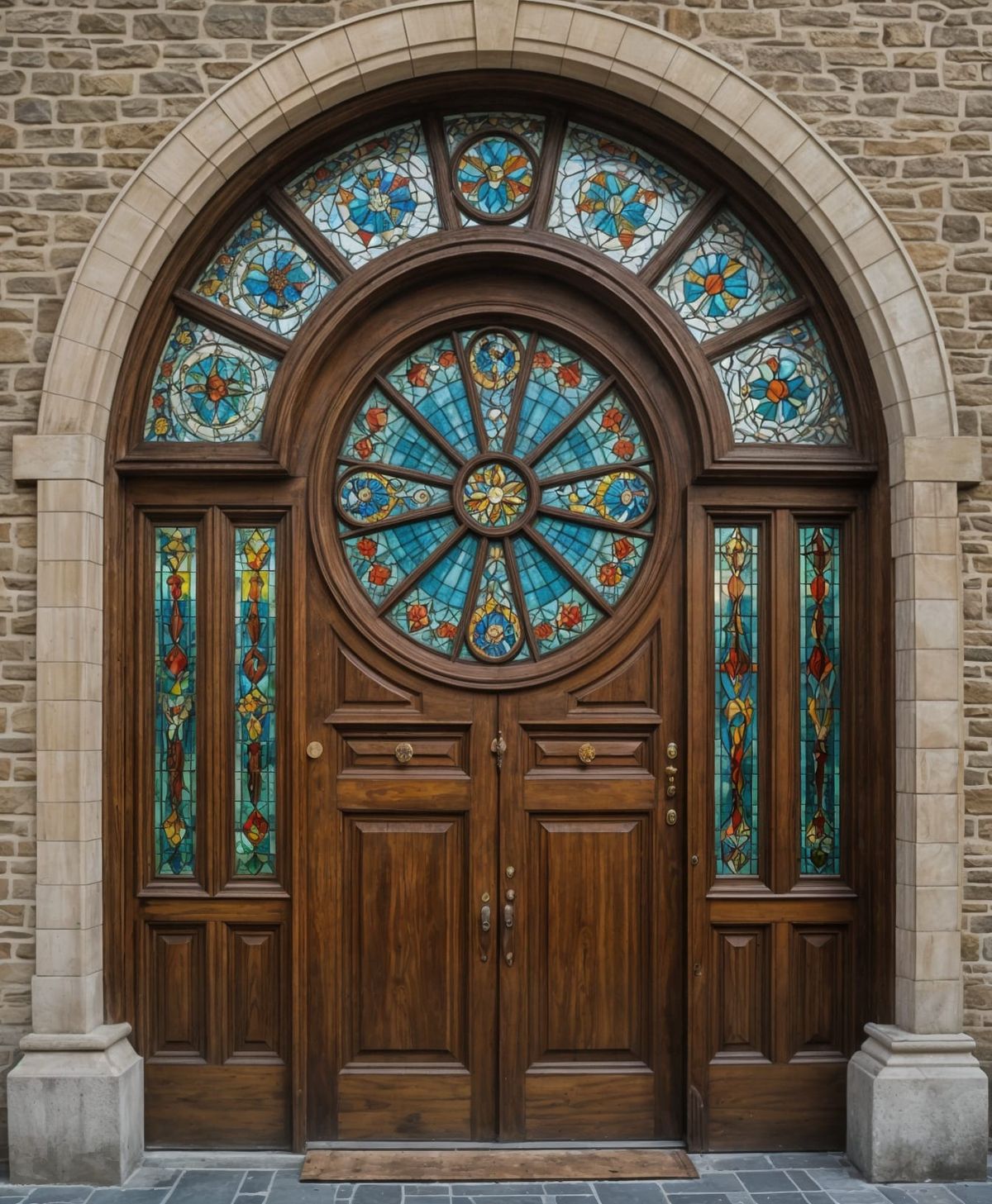 A grand church door featuring a vibrant stained glass window. The window showcases an intricate kaleidoscope design with a central cross, illuminated by divine light, creating a volumetric effect.
