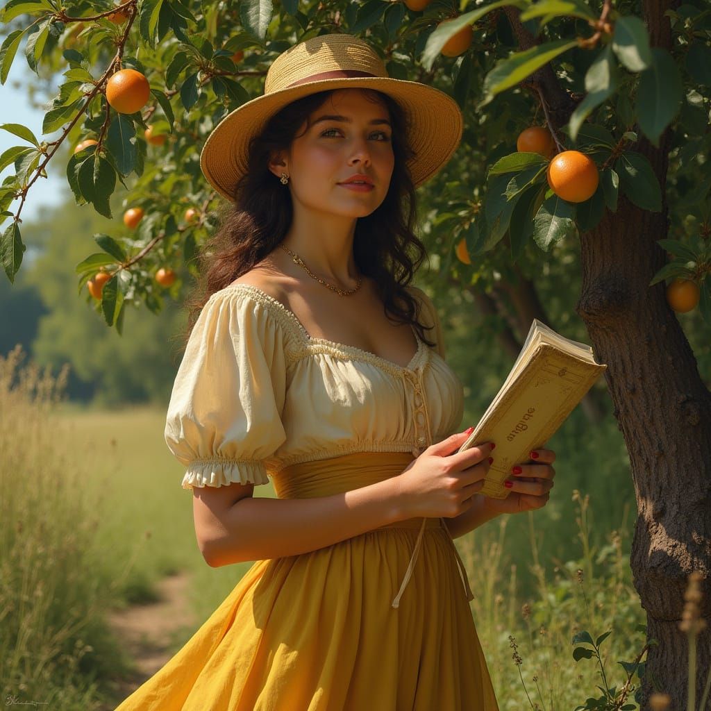 Com o vestido em tons de marfim e dourado ondulando na brisa outonal, a jovem camponesa caminha entre fileiras de macieiras, colhendo os frutos com delicadeza. A luz do amanhecer projeta sombras marcantes em sua silhueta, refletindo o drama das obras de Delacroix. Ao lado do tronco de uma árvore retorcida, ...