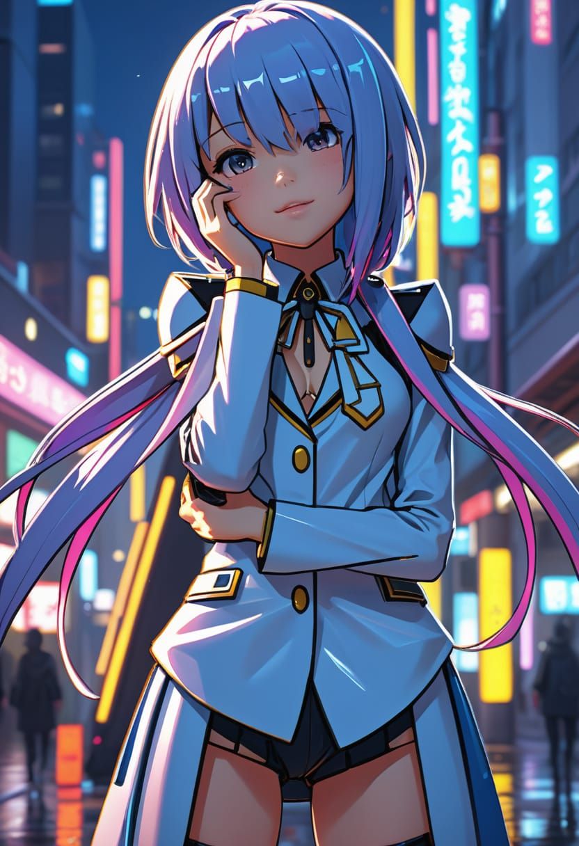 This 3D anime art features a character in a futuristic city with neon lights reflecting on wet pavement, rendered with pastel gradients and ultrafine detail.