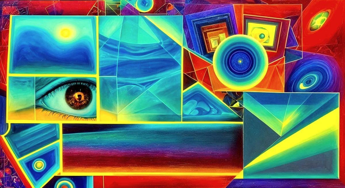 This image shows a surrealist 3D collage with overlapping geometric frames and impossible angles. It features mind-bending perspectives and vibrant neon colors in an abstract dreamscape.