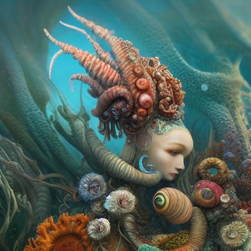 A detailed portrait of an alien empress adorned with coral and shells. The image is rendered with vibrant colors and dynamic lighting, reminiscent of pulp manga illustrations.