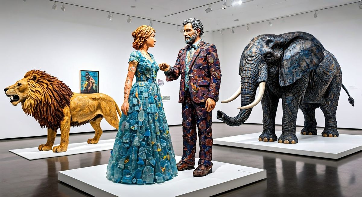 A striking picture of contemporary sculptures of a man and woman created from recycled plastic. Dynamic animal sculptures surround them in a white art museum, with photographic lighting, shine, and transparency.