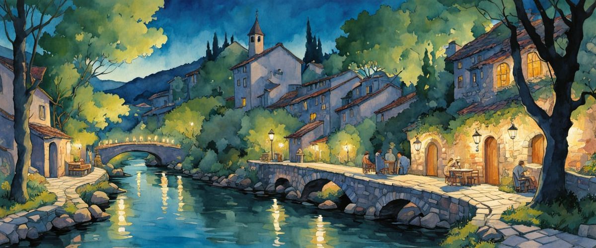 This image shows a vibrant town square with stone buildings, restaurants, and a creek. The scene is rendered in a comic book style with watercolor and gouache effects, reminiscent of classic animation.