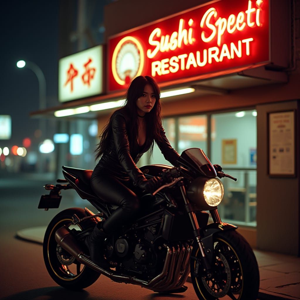 A stunning film still of a biker girl in tight black leather, sitting confidently on her motorcycle outside a sushi restaurant, bathed in the warm glow of neon lights, with a cinematic feel and gritty realism, blending Japanese and American cultures.