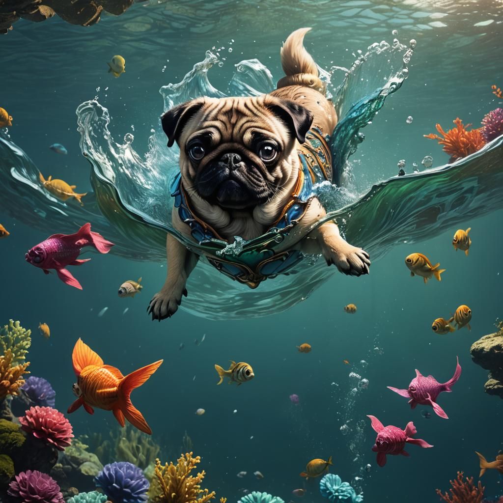 A vibrant digital painting of a pug mermaid swimming underwater. The artwork features intricate details and complementary colors, reminiscent of fantasy concept art in 8k resolution.