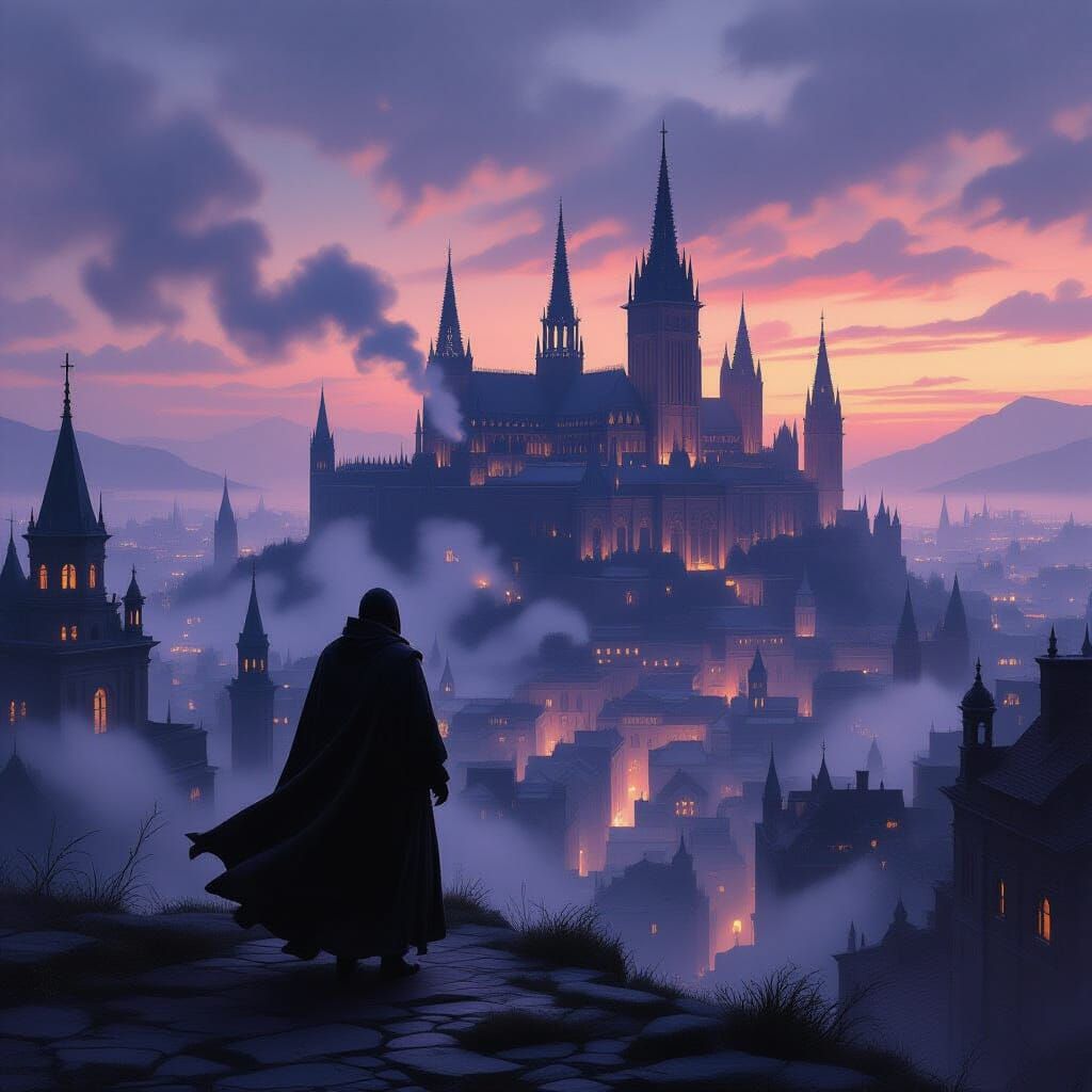 A lone person in a coat surveys an old city from a windy hilltop. Gothic and art deco buildings feature spires, carvings, and shadows, all lit by twilight in the style of classic oil paintings.