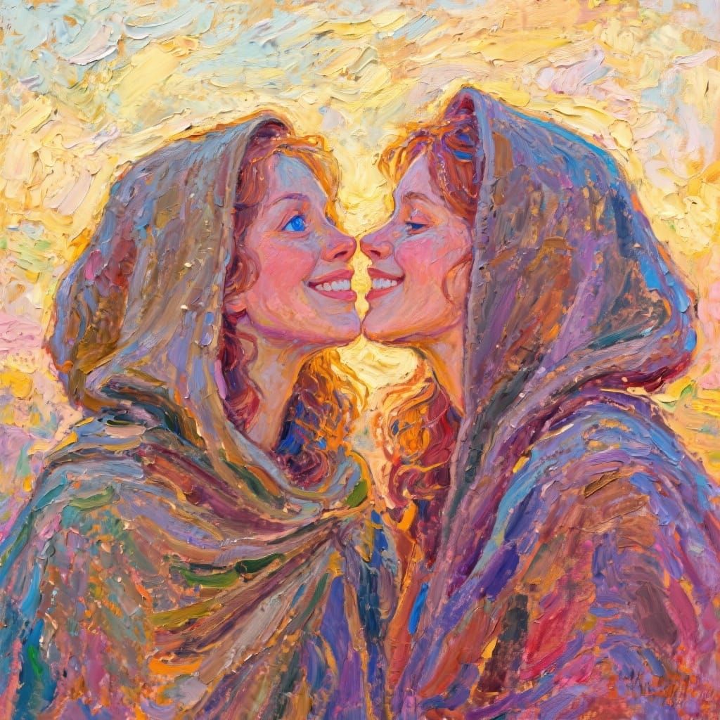 This image shows two women in hooded capes sharing a kiss, depicted in a vibrant impasto oil painting style with thick, textured brushstrokes and bold colors. Soft golden hour light creates dramatic highlights.