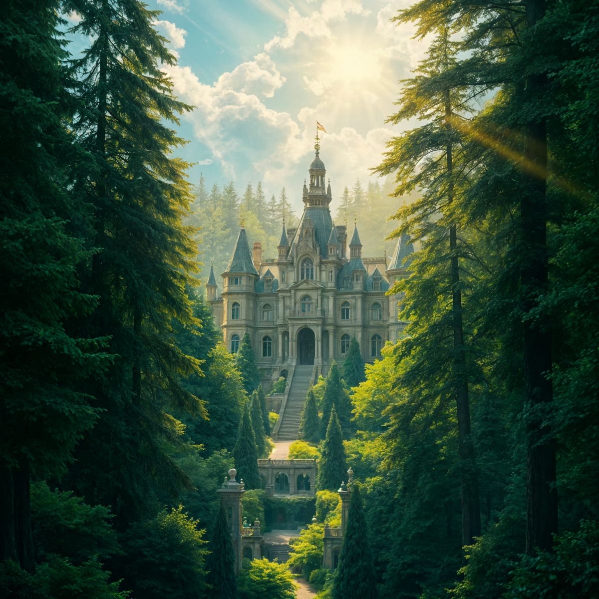 This image shows a majestic palace nestled within a dark, green forest. Soft, bright rays of sunshine pierce through the clouds, creating a divine and ethereal atmosphere around the holy site.
