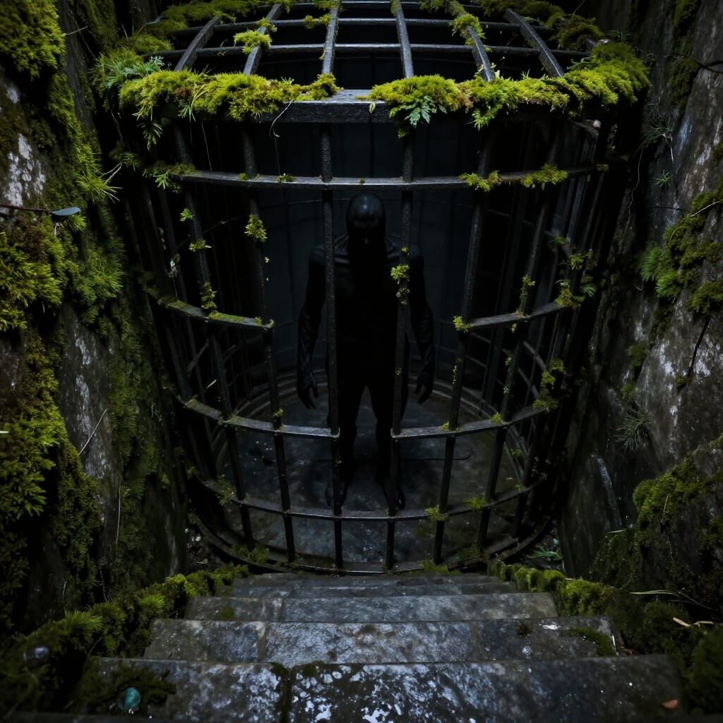 This image shows a hyperrealistic, unsettling stairway leading to a moss-covered cage with a menacing shadow figure inside. Dramatic lighting enhances the dark, dread-filled atmosphere.