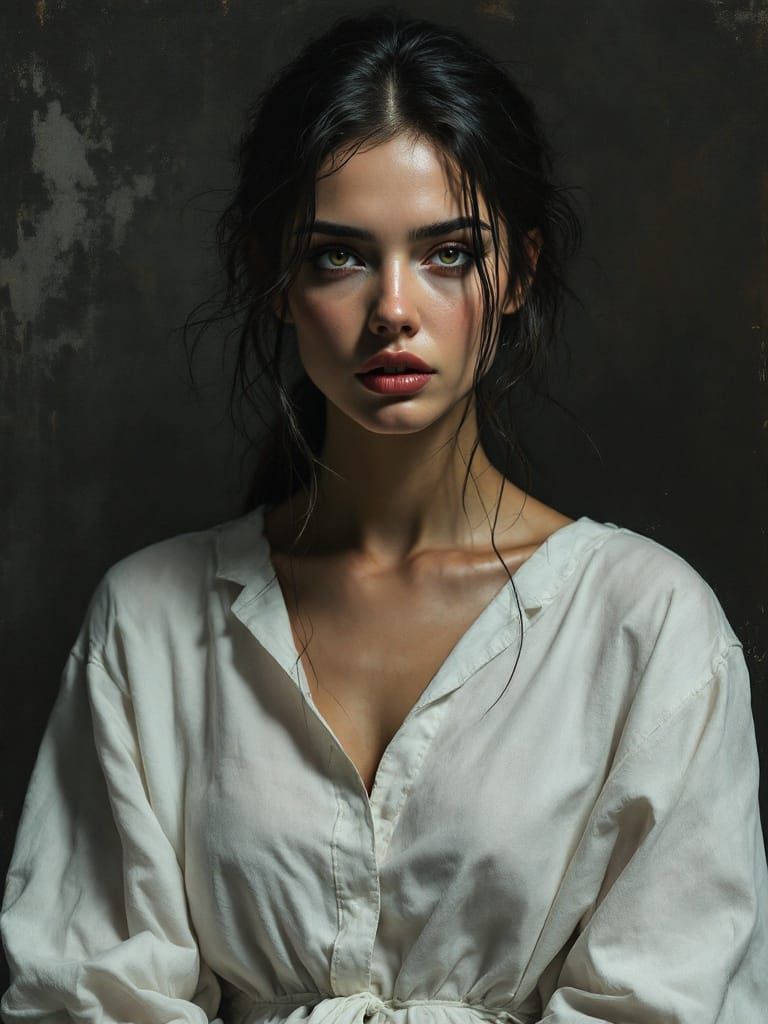 A high contrast fashion photograph of a figure in a white linen dress. The image blends stark emotional rendering with haunting colors, existential emptiness, and concrete-like textures, in an abstract expressionist style.