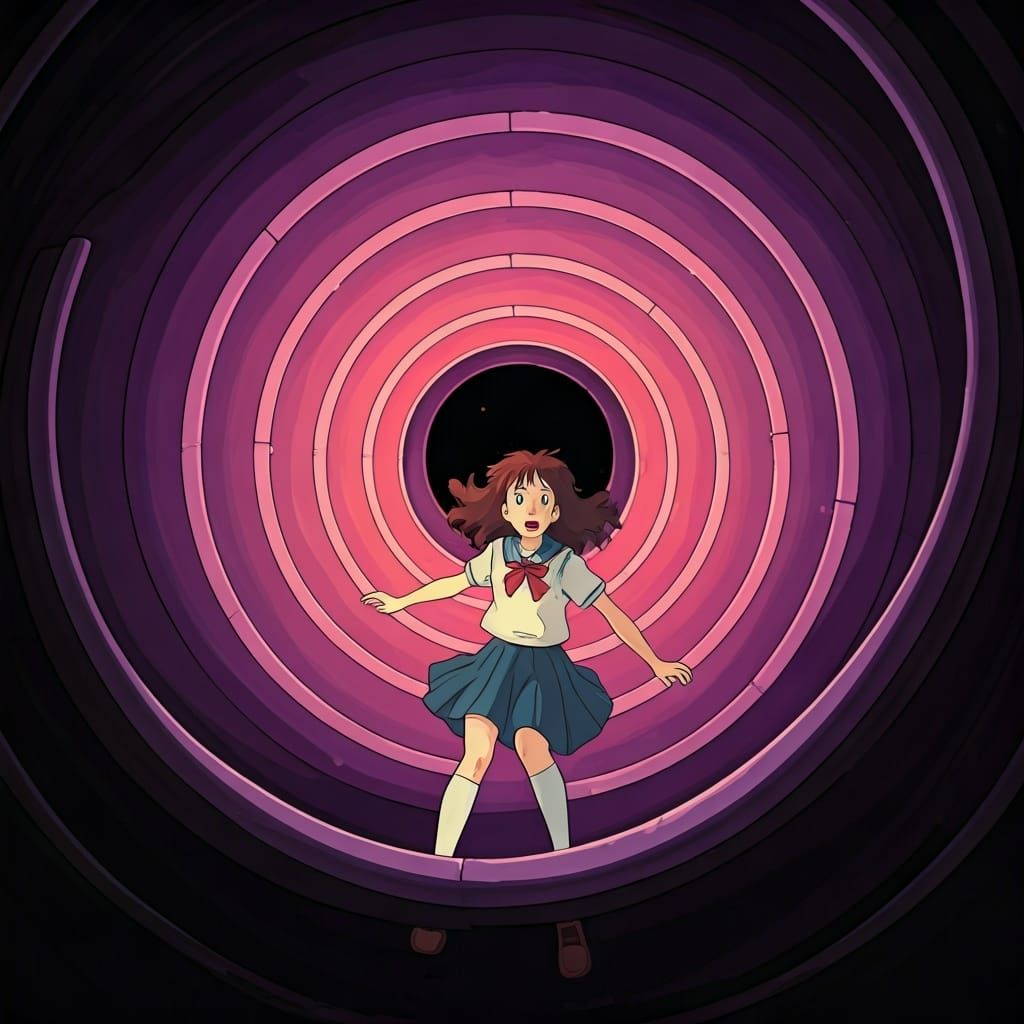 This image shows Shizuku Tsukishima on a purple slide. The artwork is reminiscent of a Studio Ghibli film with watercolor style, delicate lines, and soft textures.