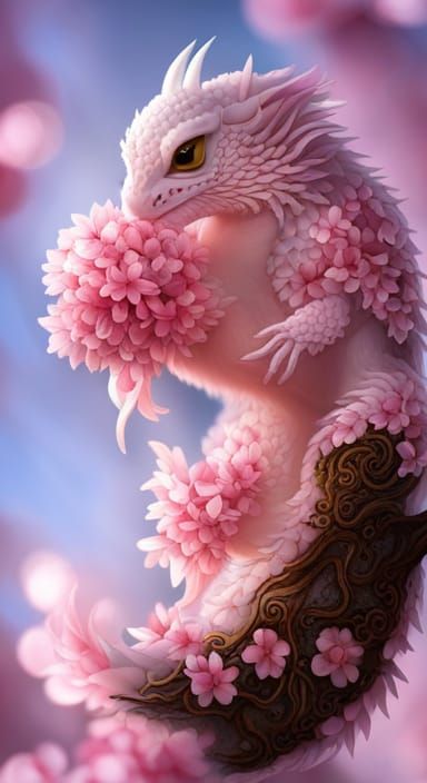 A charming image of a baby cherry blossom dragon hatching from a pink egg. The dragon is lizard-like with intricate details, rendered as digital art.
