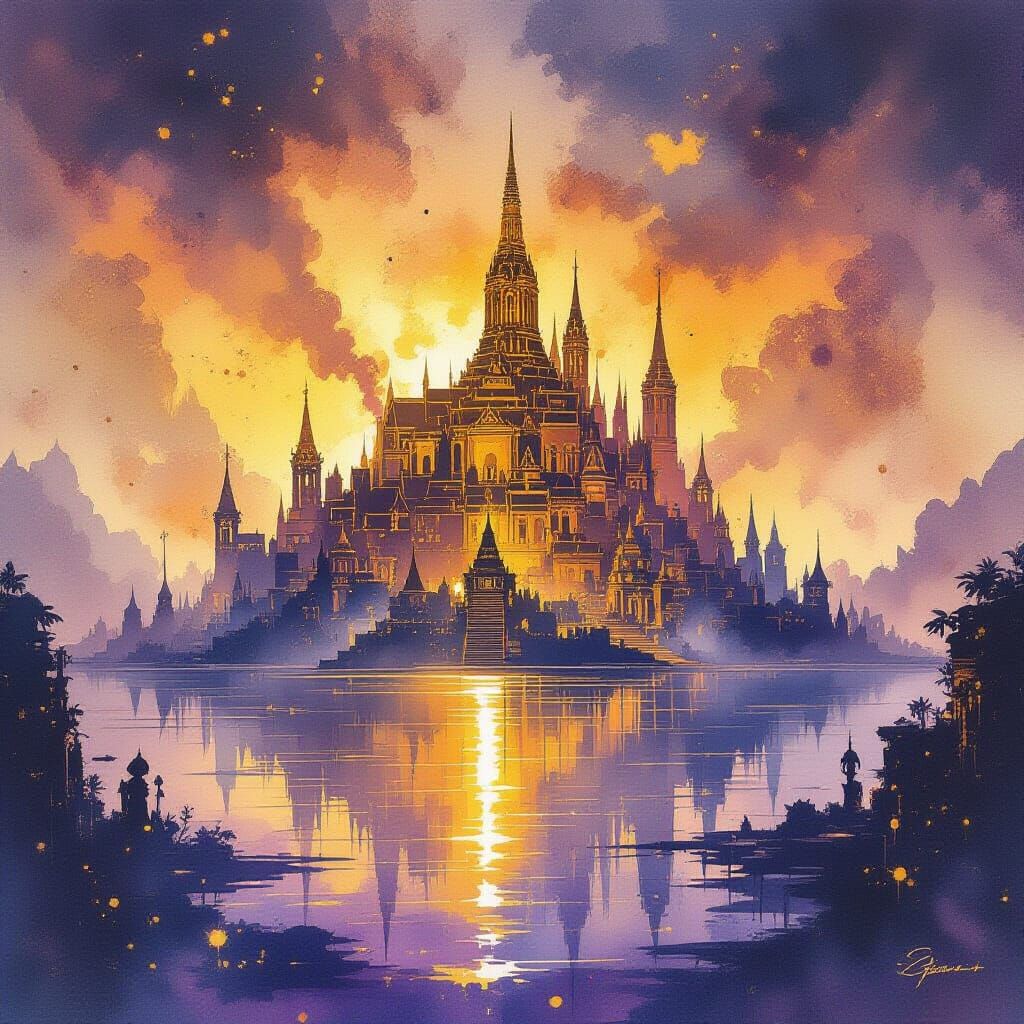 This image shows a lost golden city, destroyed and glimmering in the early morning light, rendered in a dark fantasy concept art style with vibrant complementary colors.