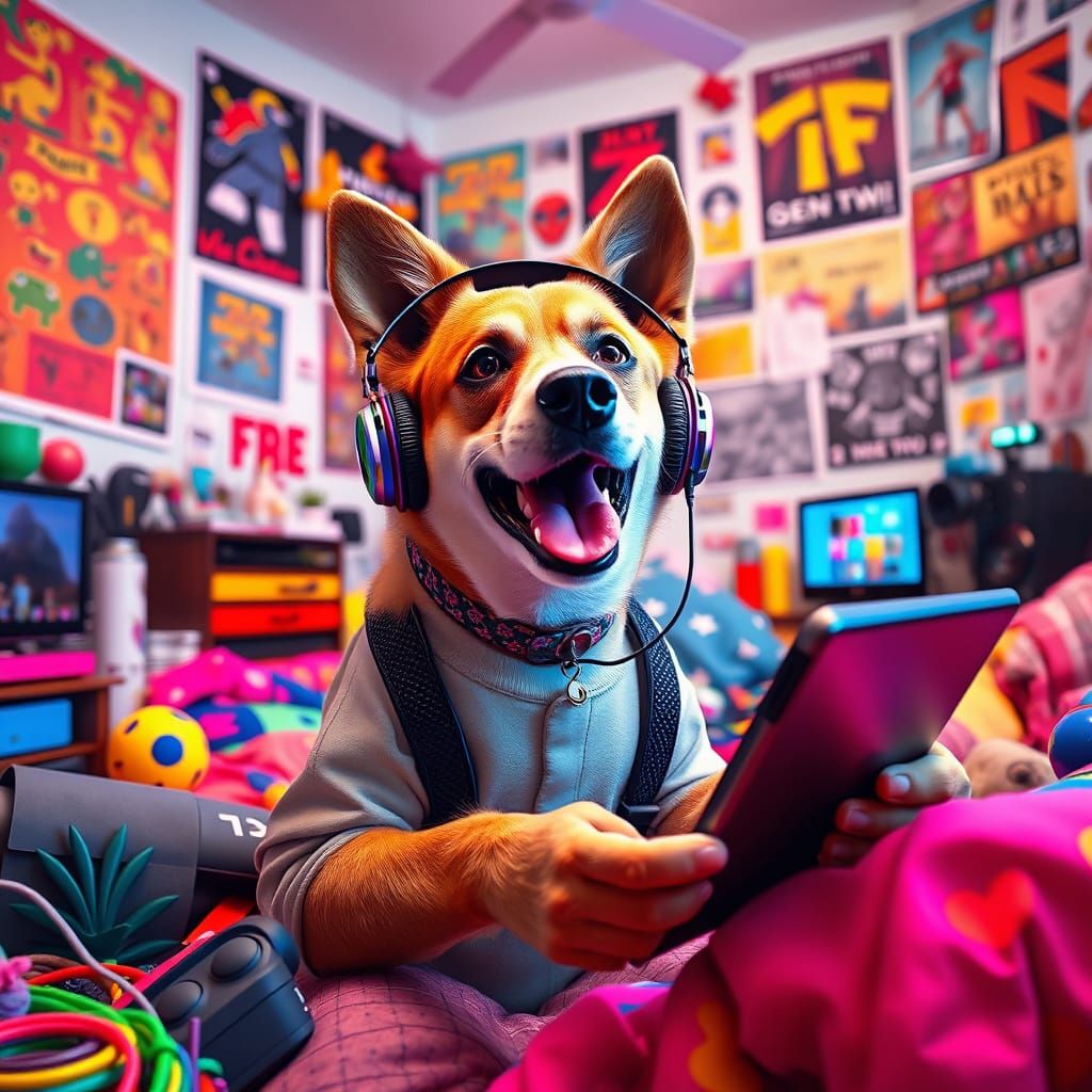 This image shows a Gen Z dog streaming from a colorful, chaotic bedroom, surrounded by toys and tech. The high-contrast digital art style evokes glitchcore aesthetics and dynamic energy.