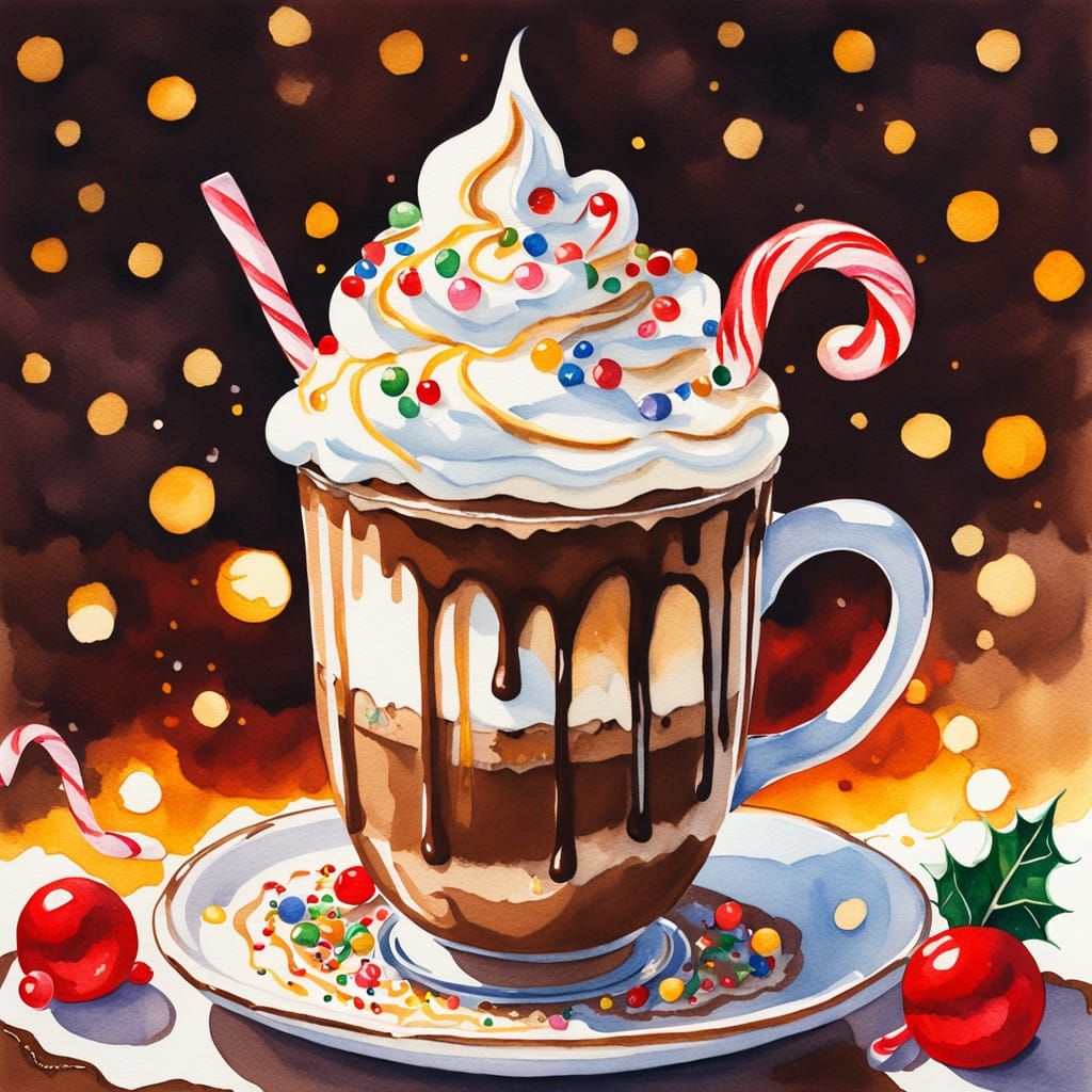 A watercolor painting depicts a festive cup of hot chocolate with whipped cream, candy cane, and holly. The image is rendered in a whimsical style with soft brushstrokes and warm lighting.