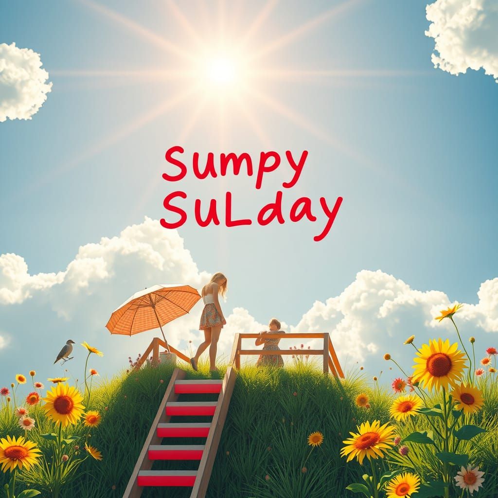 This image showcases a vibrant summer scene in a whimsical Wes Anderson-inspired style, filled with intricate details and warm sunshine rays.