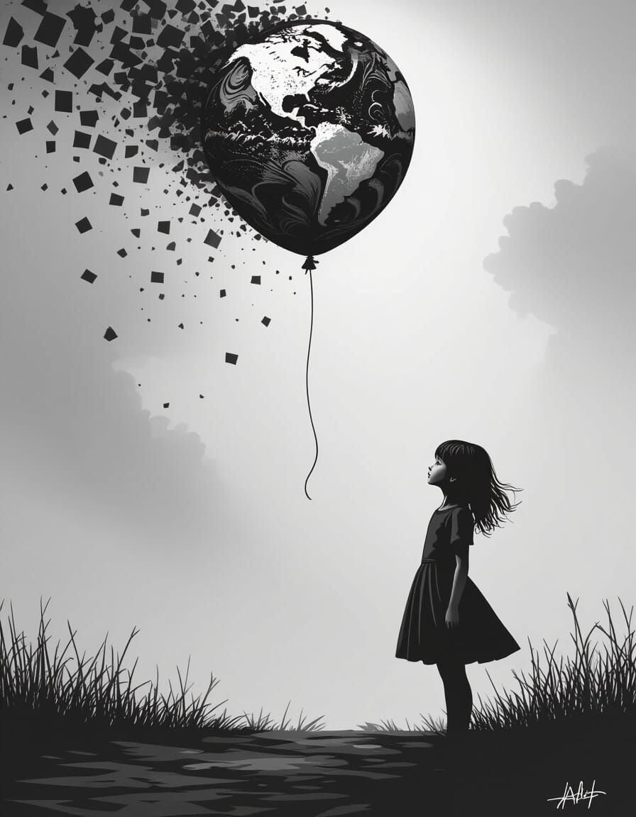 A monochrome artwork featuring a girl with an Earth-shaped balloon. This stylized polygon art evokes a dreamlike, fantastical atmosphere with intricate details and calligraphy ink elements.
