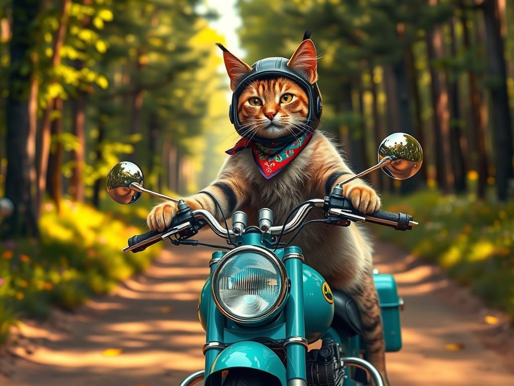 A striking picture of a fluffy cat wearing a helmet and bandana riding a motorcycle. The image, in a playful realism style, features vibrant colors and detailed fur textures.