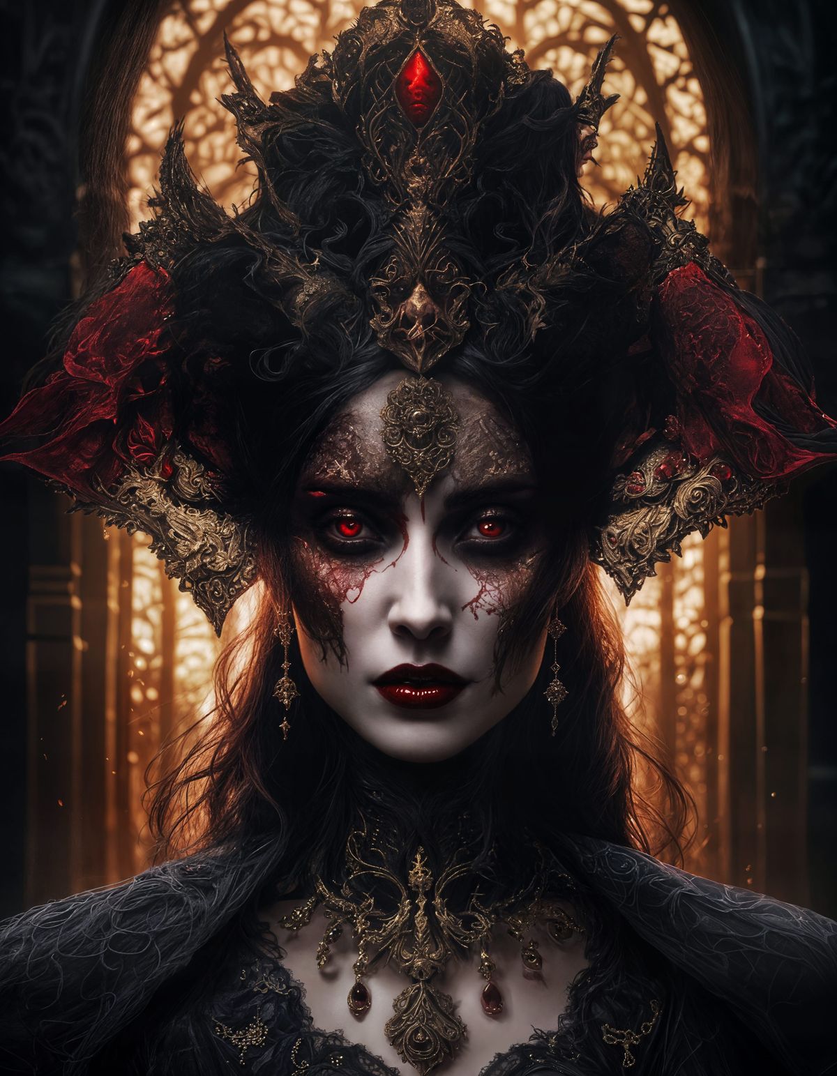 This image shows a beautiful woman as a blood lord. The character is presented with photorealistic detail and minimal clothing in this 8k resolution image.