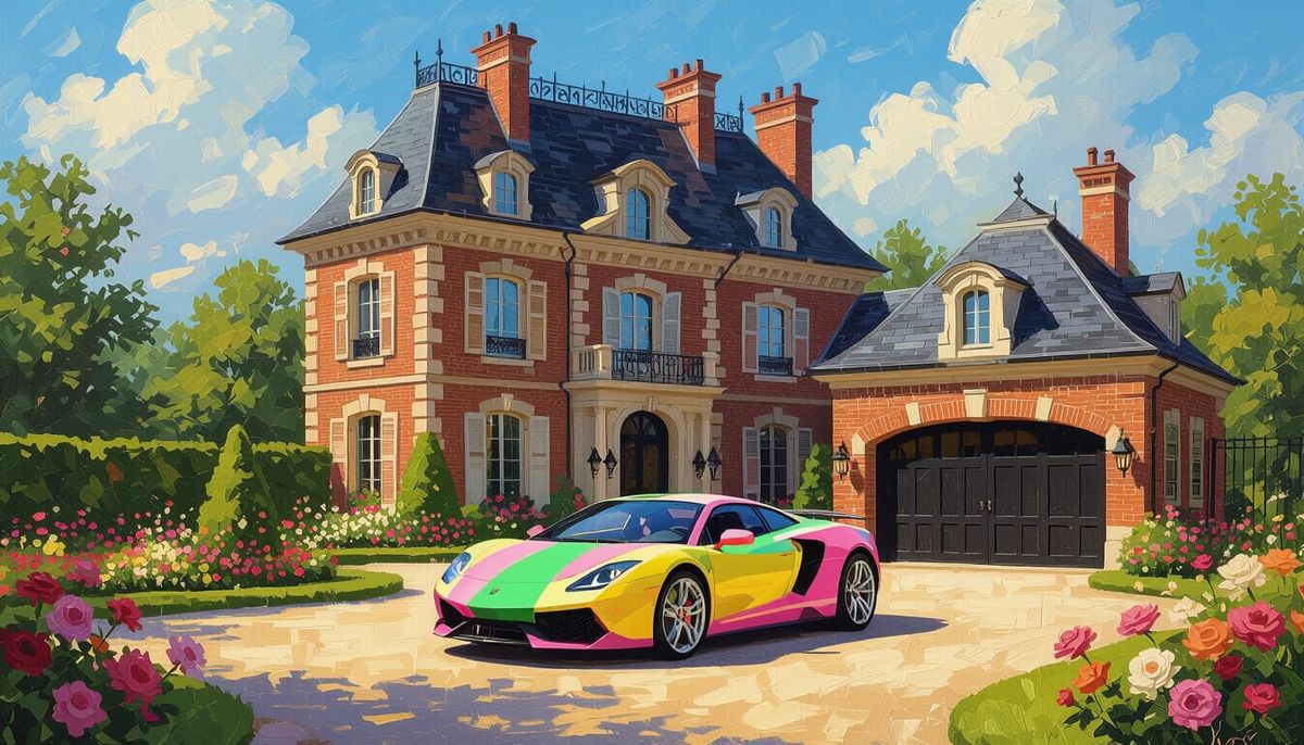 This image depicts a grand brick chateau and a colorful sportscar nestled in a lush flower garden under a bright, cloudy sky. Rendered with textured realism and soft, dynamic lighting, evoking Impressionistic art.