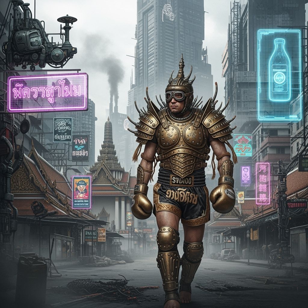 A striking picture of a steampunk Muay Thai fighter in brass armor walking through a neon Bangkok street. The scene blends ancient temples with futuristic skyscrapers in a dystopian aesthetic.
