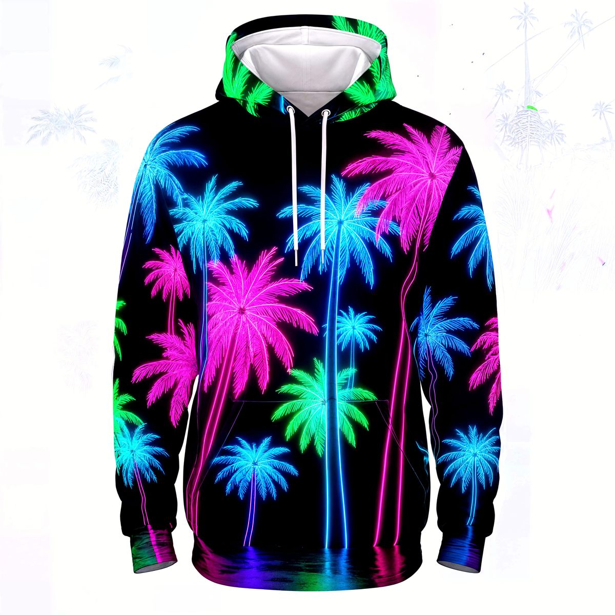 A hyper-detailed ray-traced image, cinematic and photorealistic, of a white hoodie featuring a pattern of neon-glowing palm trees. The palm trees glow with vibrant neon pink, blue, and green hues, set against a dark background. A neon synthwave-style sunset is depicted in the center of the hoodie. The ...