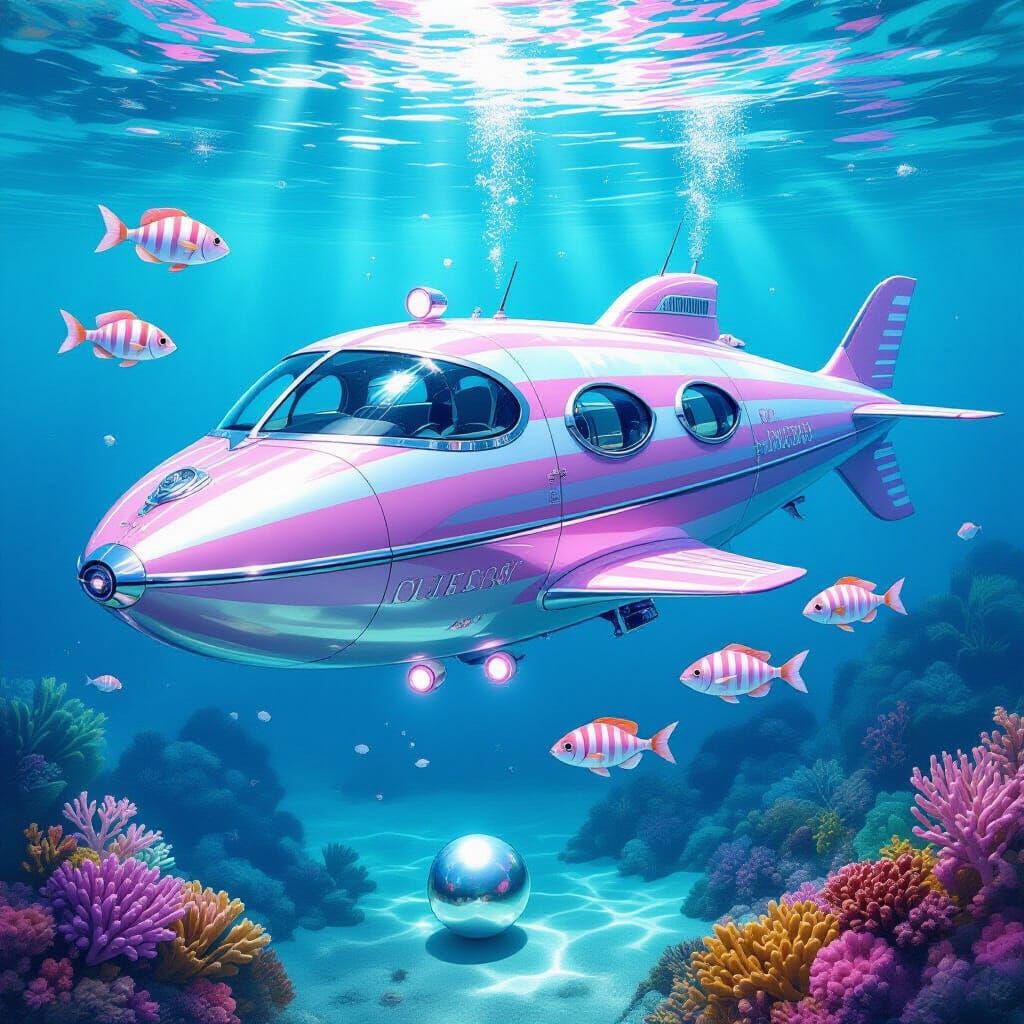 A pastel pink submarine has front windows shaped with soft feminine curves. Electronic devices, lavender LED lights, and antennae cover its surface. A school of carnation-pink and silver striped fish are swimming alongside. A shiny, reflective, silver sphere lies on the sea floor. Colorful pastel coral lines the sea floor.