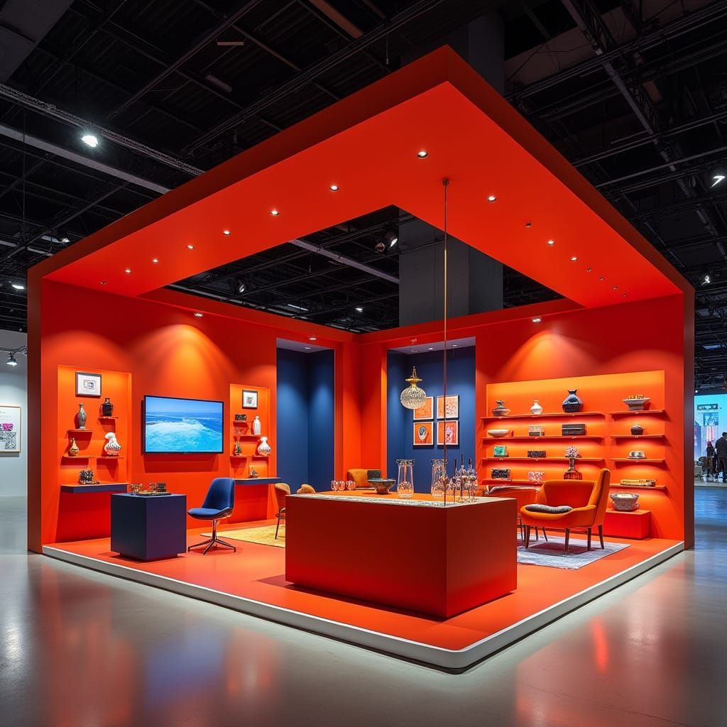 A vibrant trade show booth design in red, orange, blue, and gold. The booth features shelves, LED screens, modern lighting, sleek lines and minimalist elements in a modern style.