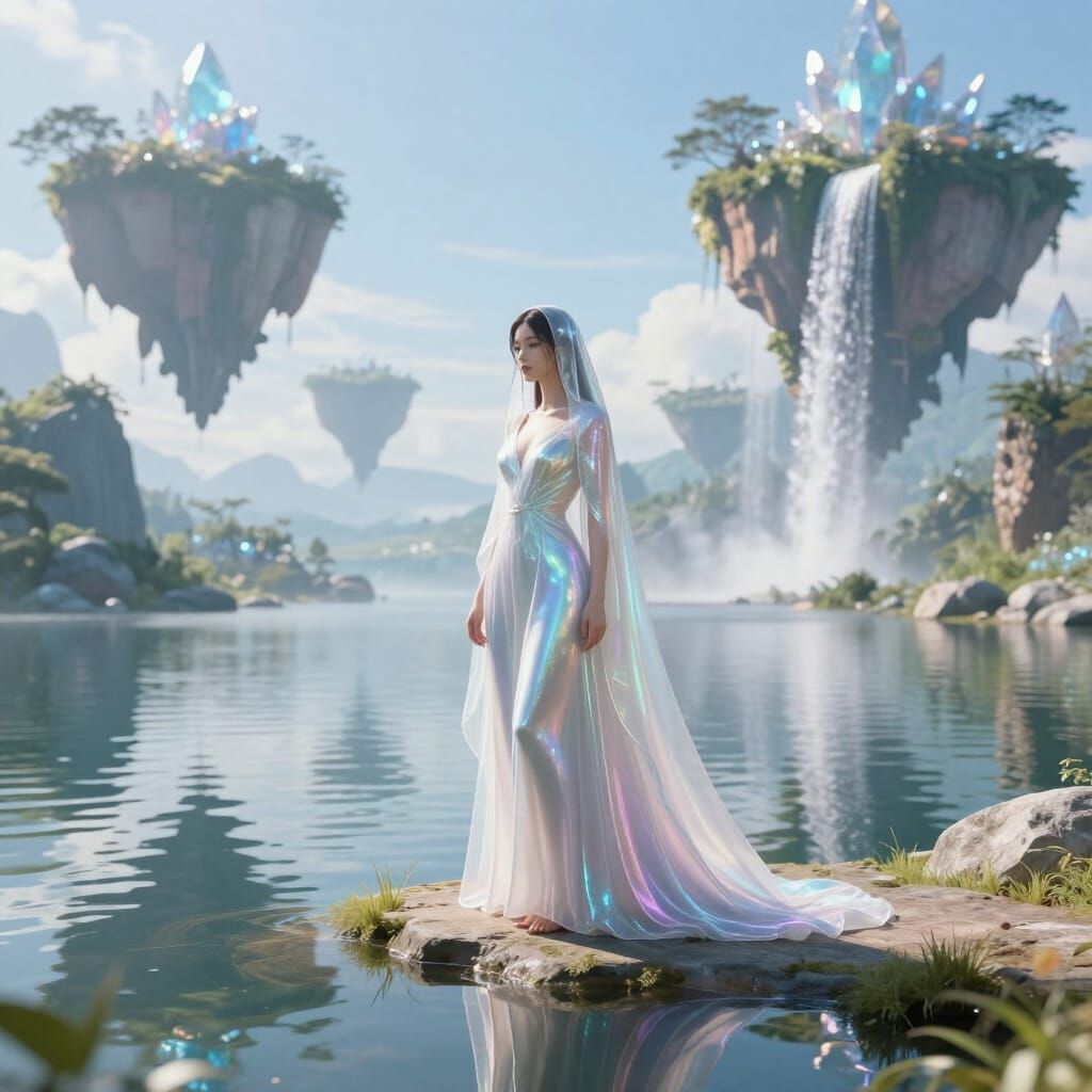 This image depicts an ethereal woman in an iridescent gown beside a sunlit lake, reflecting a fantasy landscape of floating islands and waterfalls. Rendered in photorealistic 3D art with cinematic lighting.