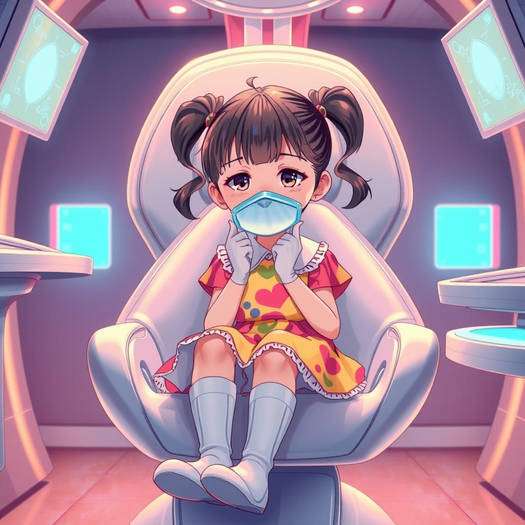 This image shows a young girl sitting nervously in a sleek futuristic dentist chair, surrounded by vibrant holographic displays, blending elements of dreamy fantasy and neon-lit futurism.