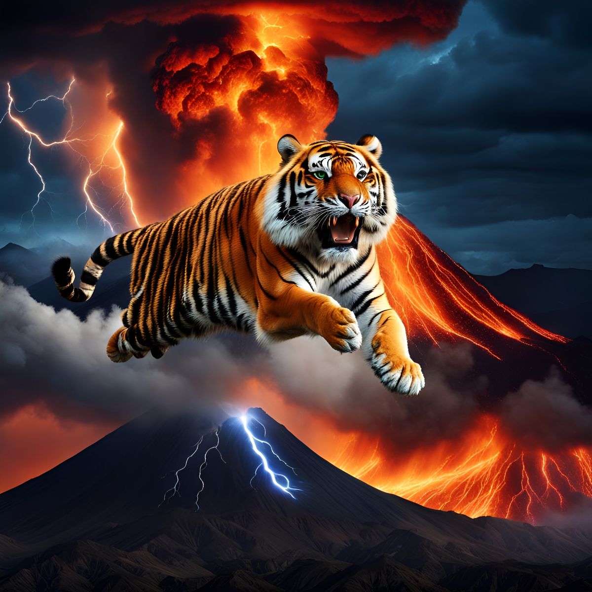 This image shows a tiger leaping from an erupting volcano amidst a lightning storm. The scene captures the raw power and beauty of nature.