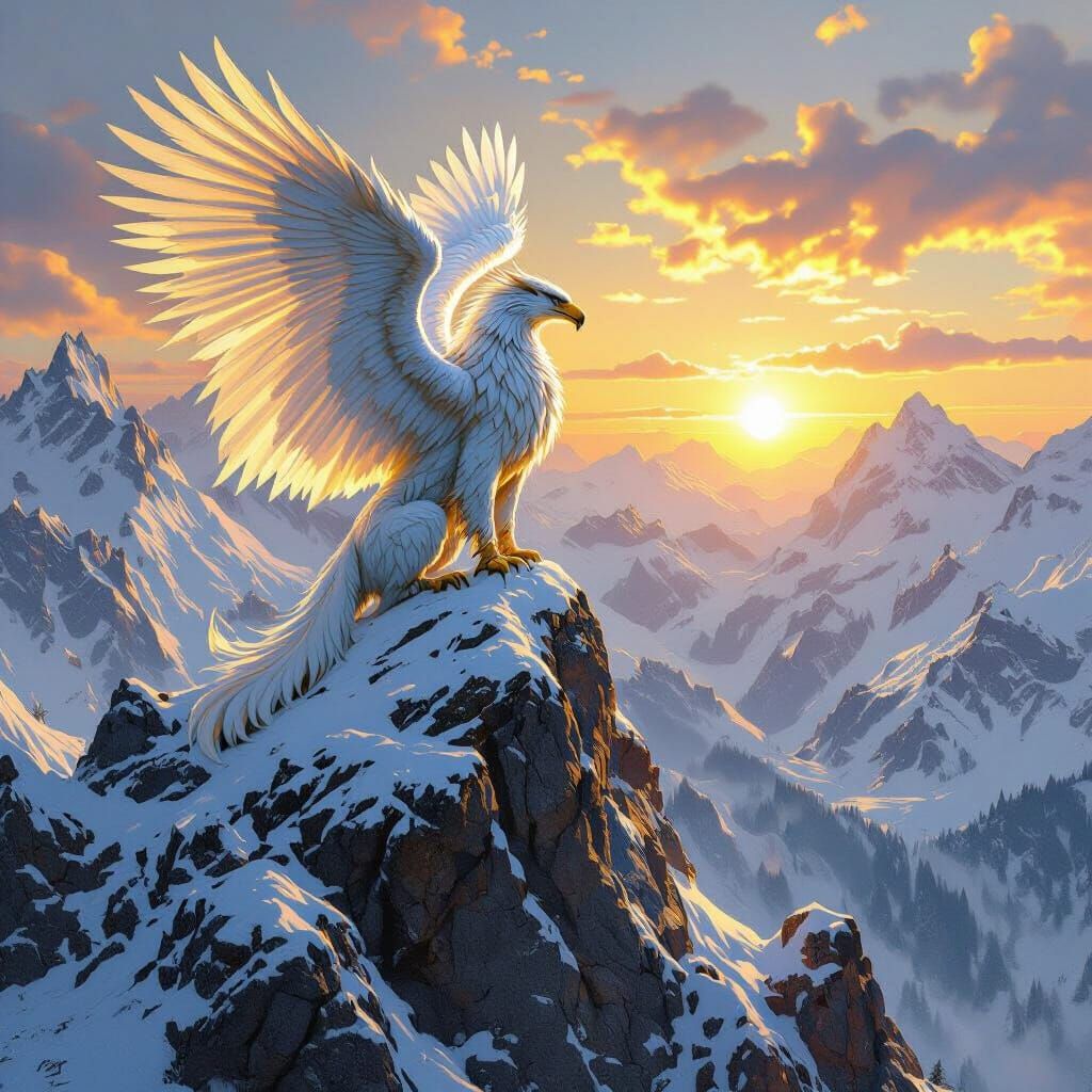 A stunning image of a griffin atop a snowy mountain peak, illuminated by the rising sun. This vibrant fantasy artwork showcases a majestic landscape with dramatic lighting and intricate details.
