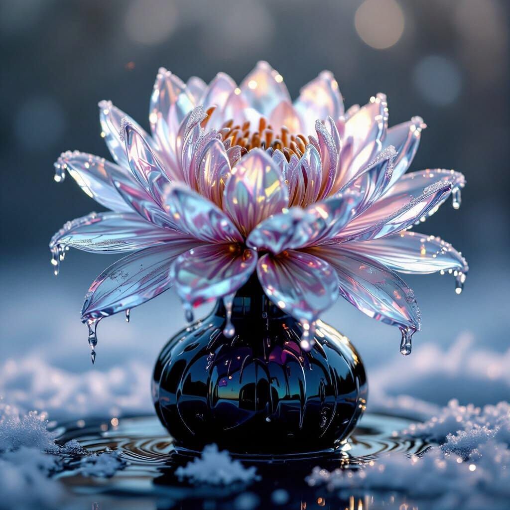 This image showcases hyperrealistic crystalline flower petals melting like ice, adorned with frost and snow. The scene features an iridescent vase and dramatic lighting in a cool color palette.