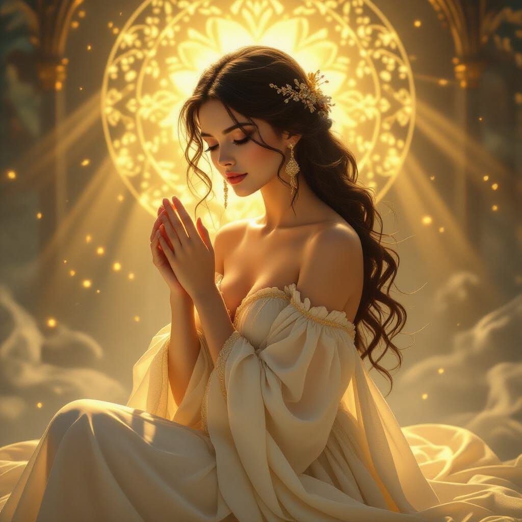 This image features an elegant young woman in a mystical, glowing atmosphere. Rendered with fine details in a fantasy realism style, it evokes a dreamlike, luminous quality.