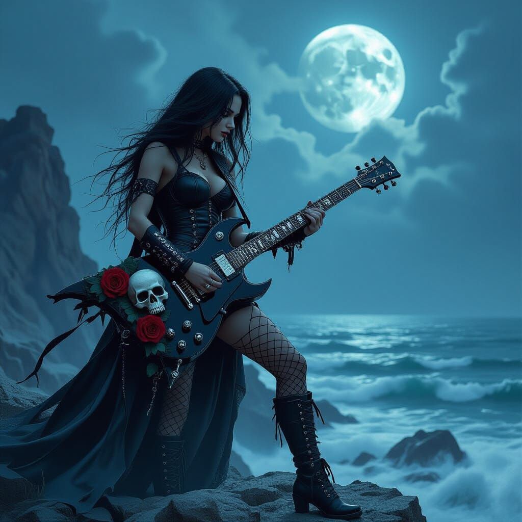 This image shows a gothic guitarist in black leather on a cliff. The guitar is decorated with skulls and roses. A stormy sea stretches out under an eerie moon, rendered in a dark fantasy style.