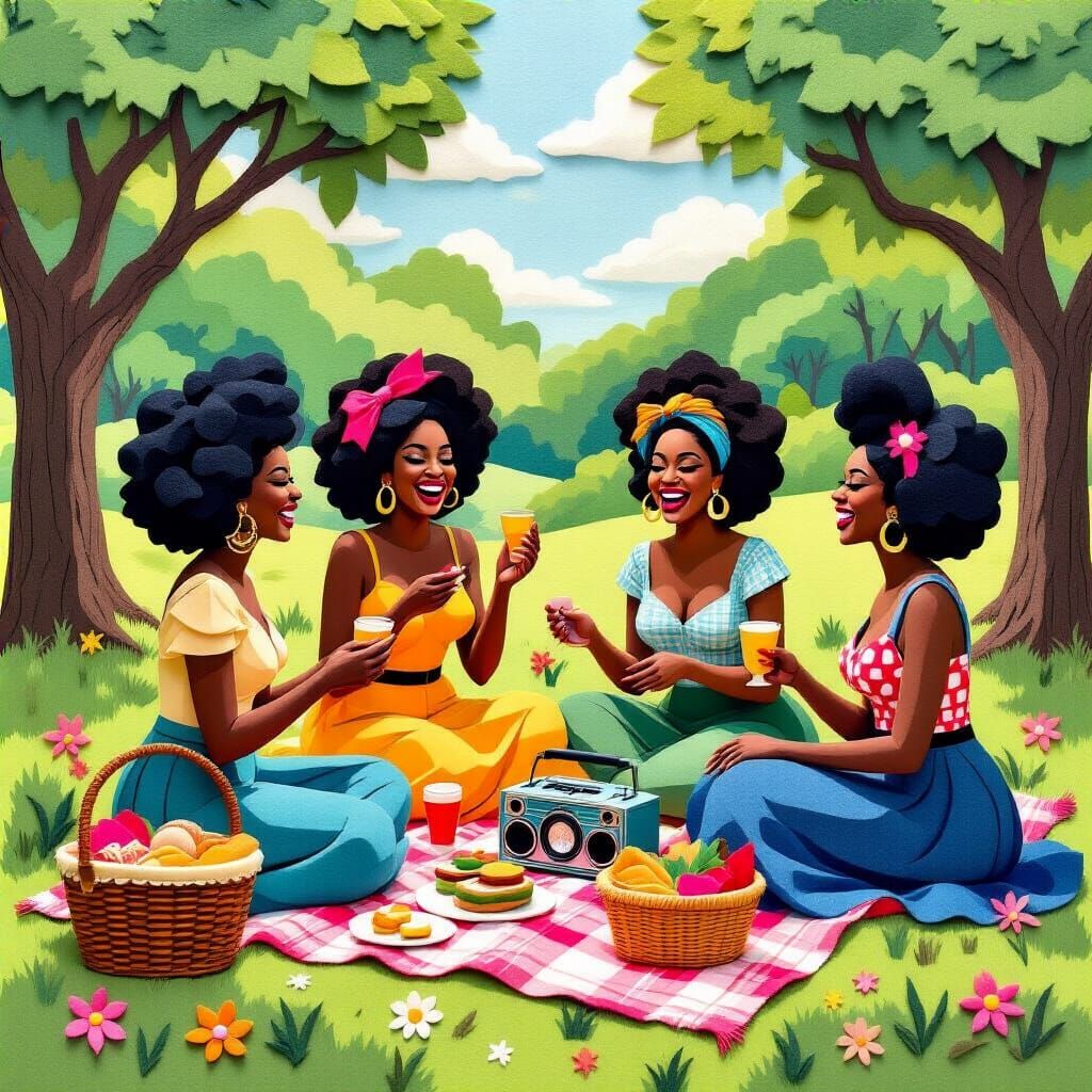 This image shows a group of fashionable African American women enjoying a picnic. The vibrant scene is depicted as layered felt art with contrasting colors and whimsical patterns.