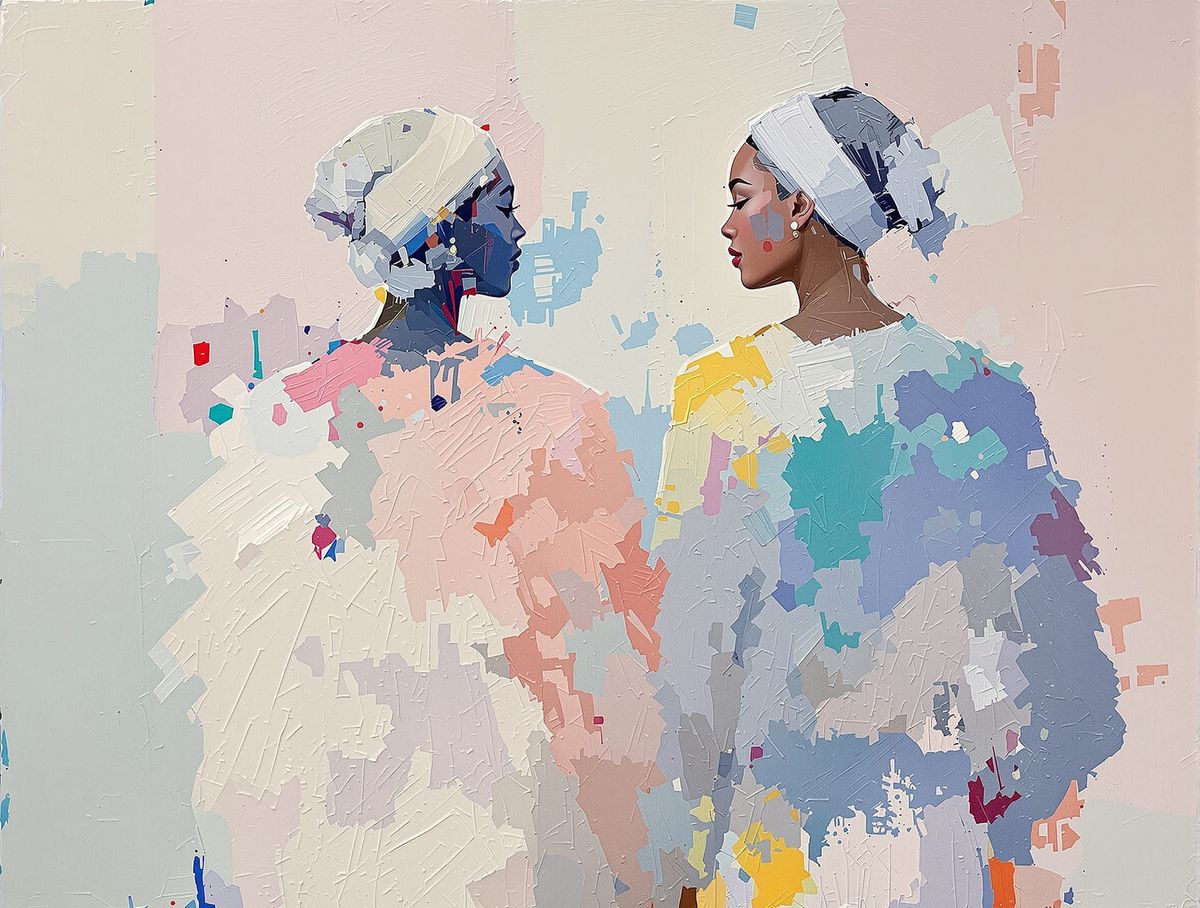 This image presents two abstract figures playing tennis, adorned in soft, feathery attire. The composition features muted pastels with striking accents, rendered with a deeply textured, light-filled impasto technique.