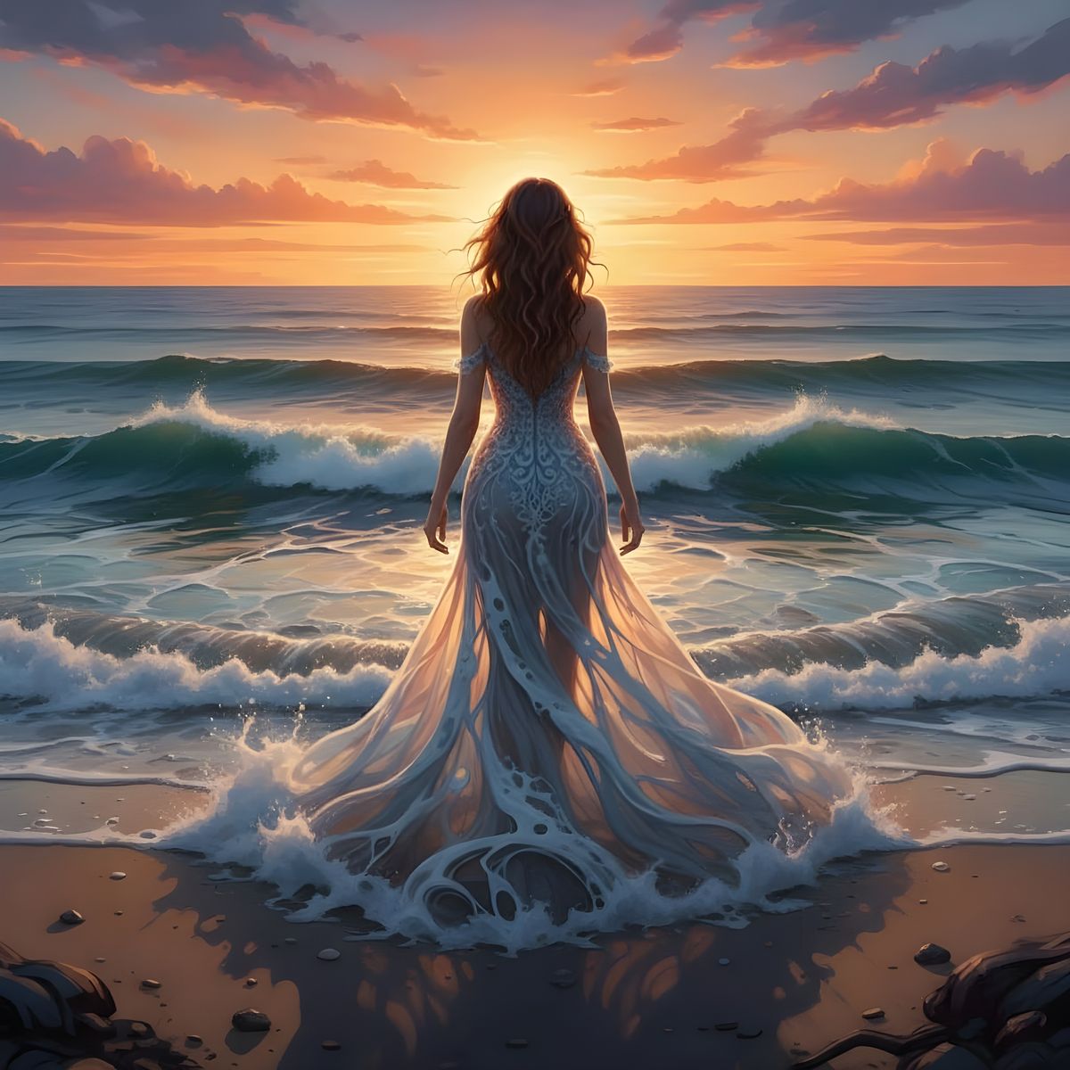 A woman in a dress of ocean water walks away from the viewer during a vibrant sunset, with energetic waves crashing. Features blues and oranges in a dreamy, ethereal style.