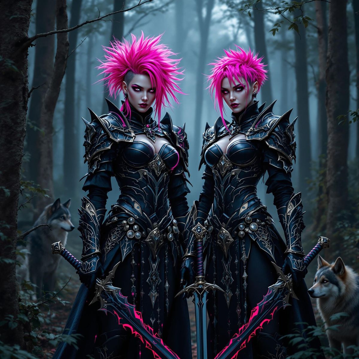 A striking picture of two gothic warrior women in a mystical forest. They are clad in ornate armor and wield swords, accompanied by wolves, in a dark, high-contrast, cinematic fantasy style.