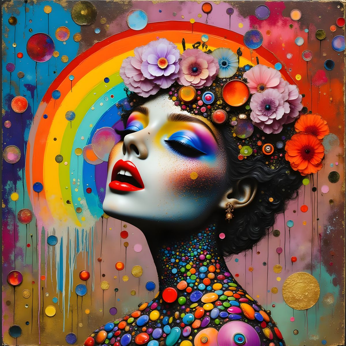 This image showcases a whimsical scene of colorful, iridescent splendor, reminiscent of a bygone era of high society elegance. Delicate details and intricate patterns come together in a hyperrealistic depiction of vibrant colors.