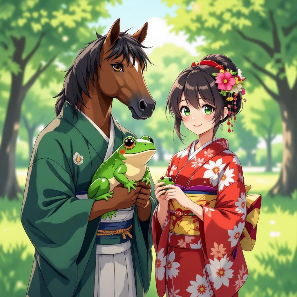 This image shows a centaur-like man in a kimono holding a frog in a park with a smiling woman. The image has a vibrant anime style, with cel-shaded textures.