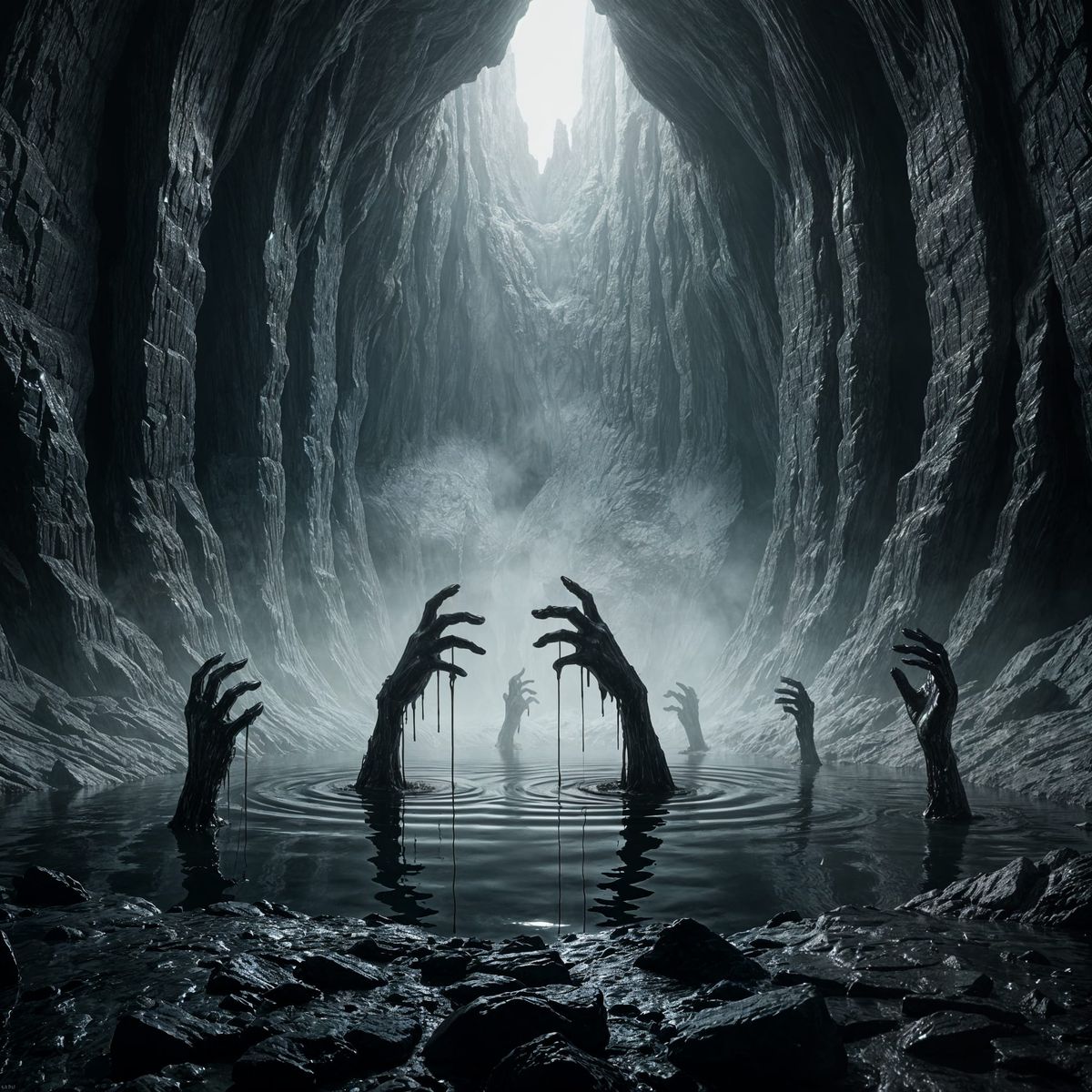 This surreal horror image depicts elongated hands rising from a still, black tar pool within a dark, damp cavern. Inspired by Beksiński, it features oil textures and dramatic chiaroscuro lighting.
